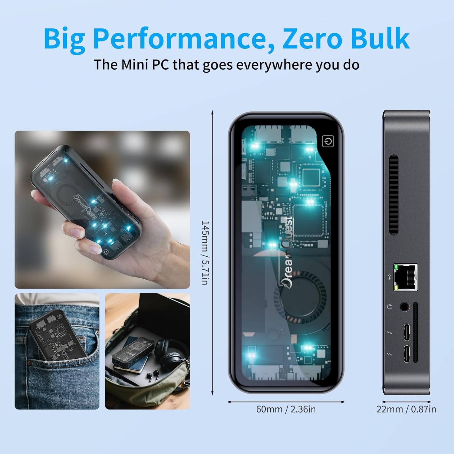 Der DreamQuest Mini PC hat eine kompakte Größe von nur 5,5 Zoll Länge, 2,3 Zoll Breite und 0,78 Zoll Höhe und wiegt nur 204 Gramm. Dies macht ihn leicht zu transportieren und ideal für den Einsatz in kleinen Räumen oder unterwegs.